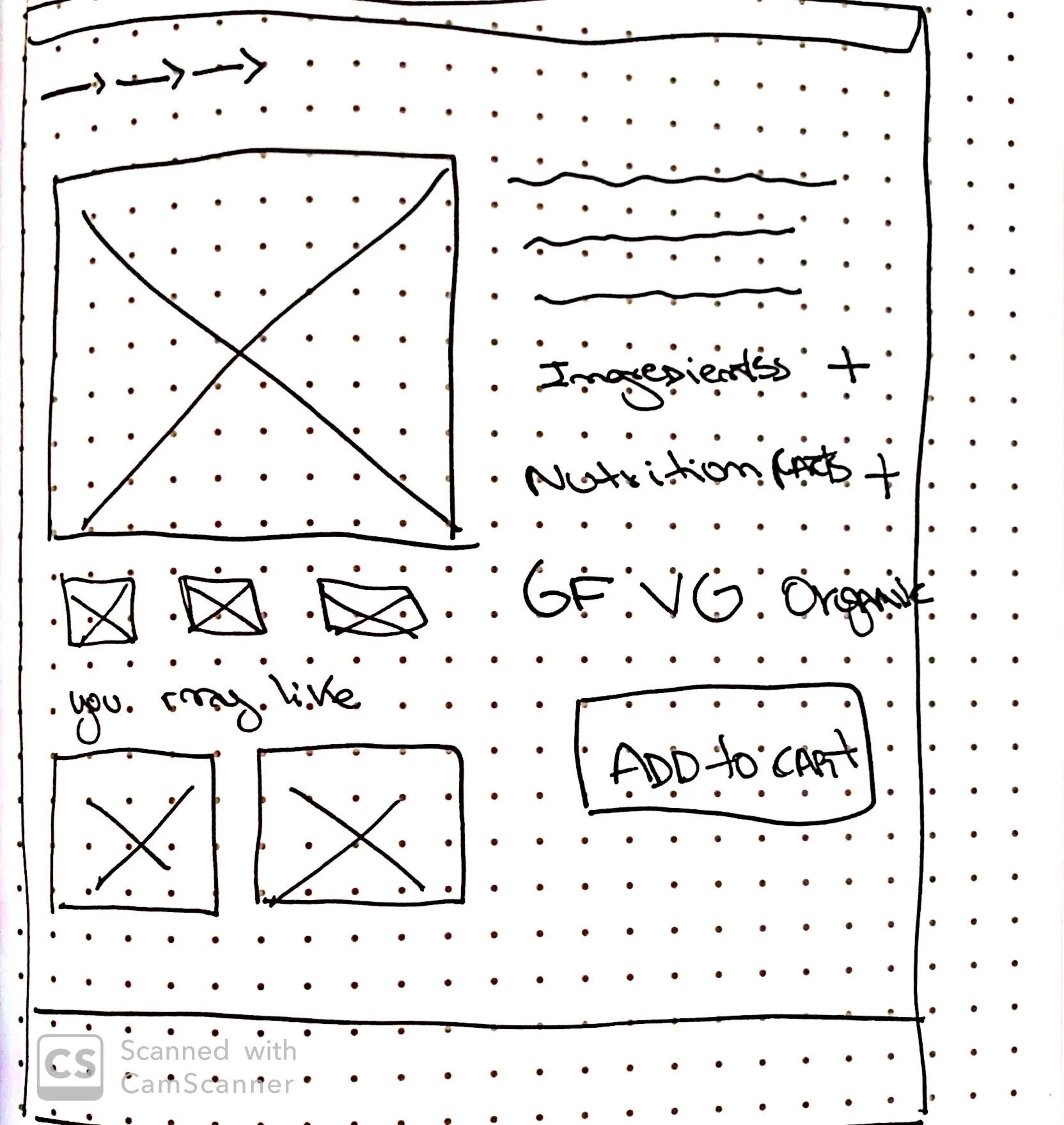 I had an idea in mind of what I wanted Nooch’s website to look like, but I wasn’t expecting to face as many challenges as I did. I first worked on my two user flows, which were clear and objective because of my persona’s goals. I first started sketching the home page, which will be the starting point for both user flows. The second page I sketched was the product screen since it was crucial to show all the dietary information on this page.