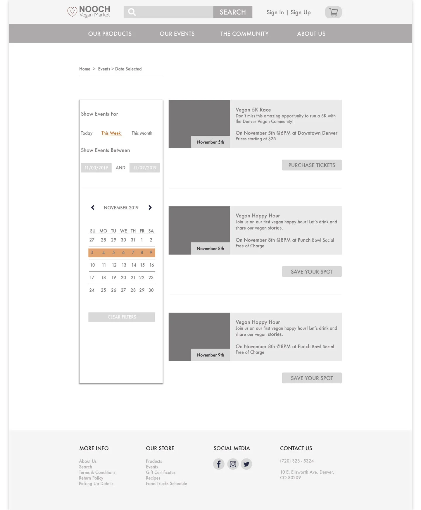 I finally decided to divide the menu bar into four sections: our products, our events, the community, about us. Under “our products”, I shortened it into only four main categories which turned out to be: grocery aisle, ready to eat, beauty & household, and refrigerated & frozen. Thanks to all the research, I was confident that I found the best solution for Nooch’s website information architecture.